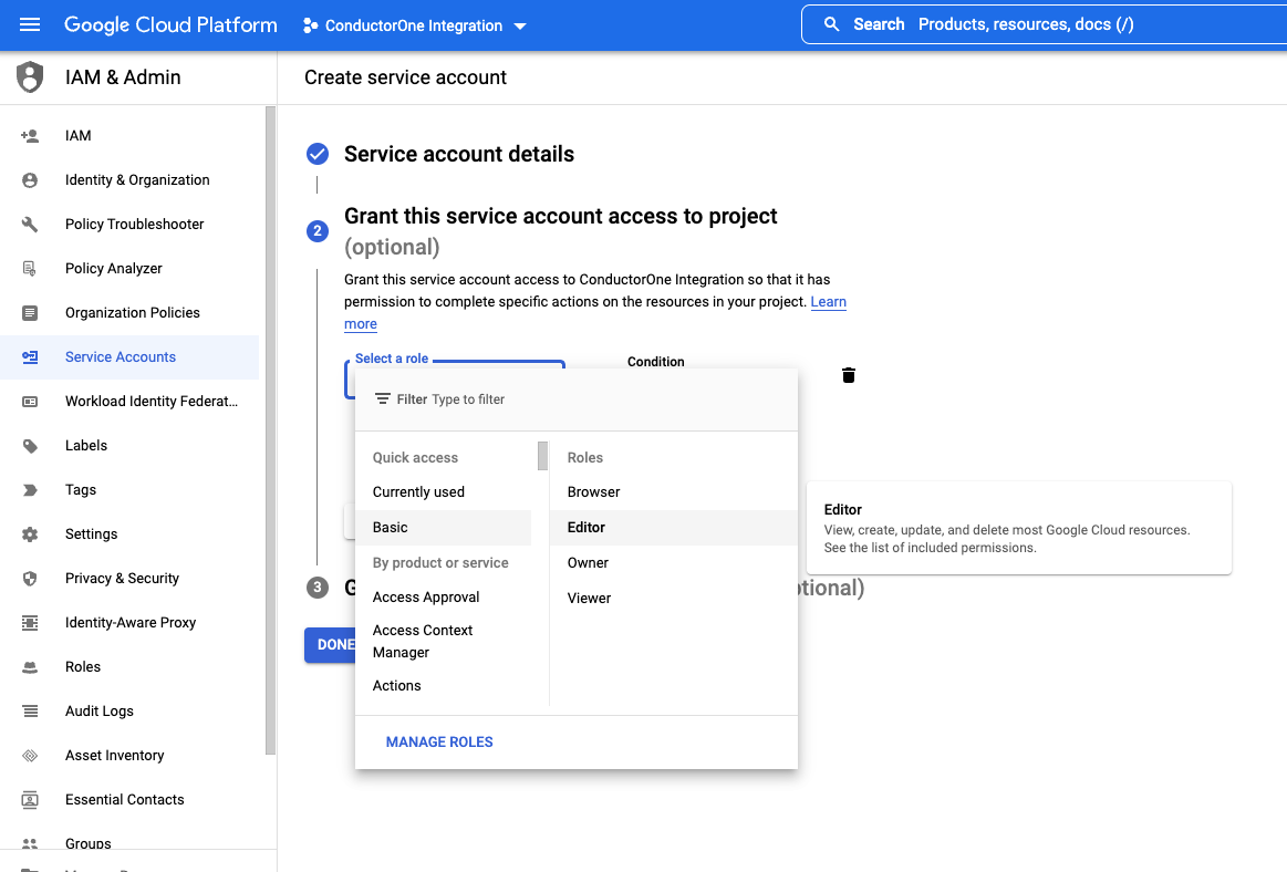 - Service account name: ConductorOne Integration
